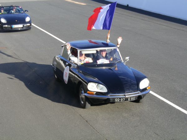Le balcon des stands de ravitaillement offre un poste plus élevé aux photographes amateurs. François Allain véhicule un illustre passager, Jean-Claude Andruet à bord de la DS21 vue au dernier Tour Auto