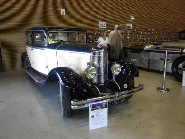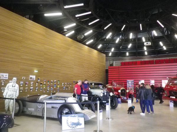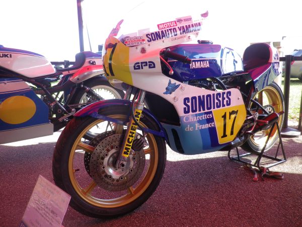 Le bâtiment « 1924 » reçoit quelques raretés dont cette Panhard et Levassor 6CS (1931) à moteur 6cyl. sans soupapes. A l’extérieur, on voit des motos: la #17 est une authentique Yamaha 352 TZ de 1978 ex Christian Sarron.